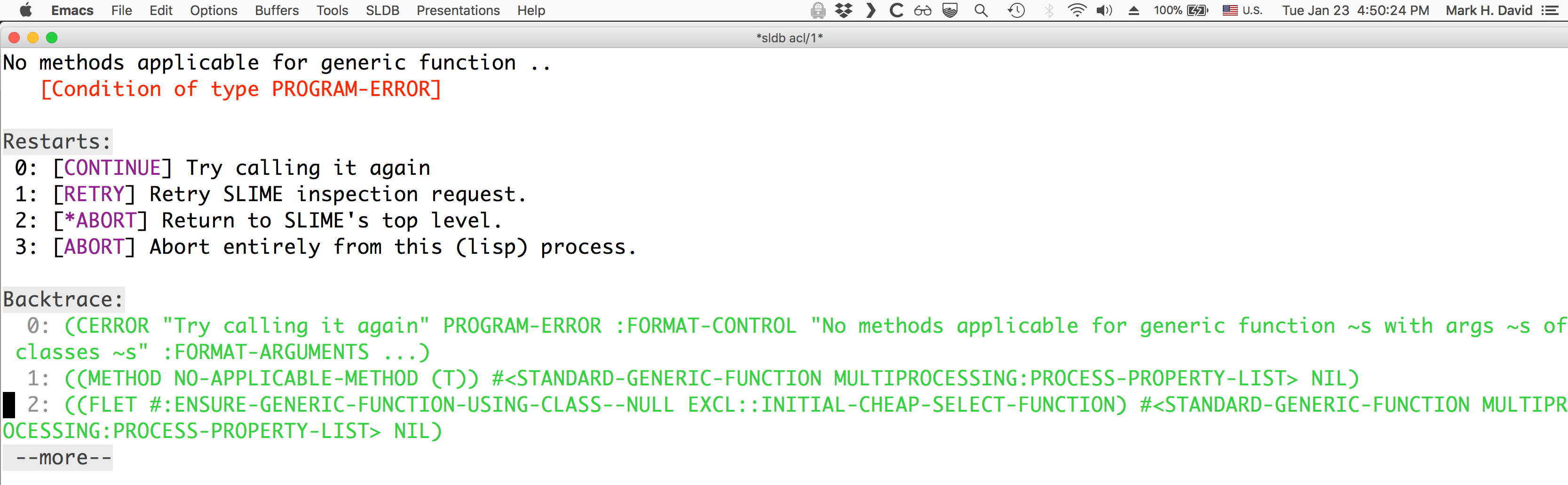 The screen shot shows that the debugger is somewhere in no-applicable-method MULTIPROCESSING:PROCESS-PROPERTY-LIST.