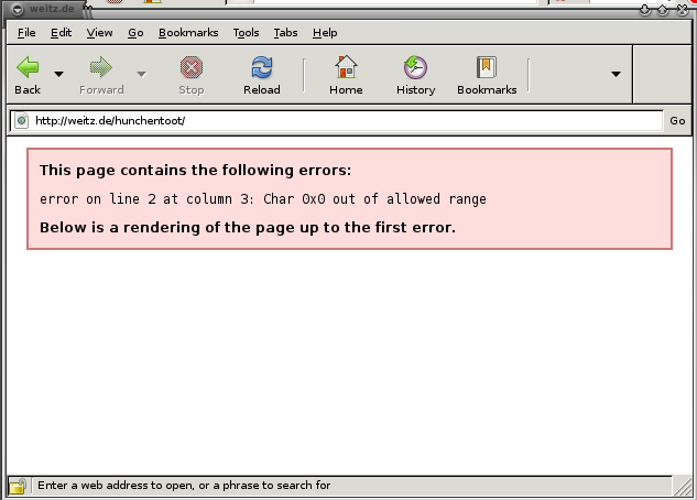 Forgot the attachments JKC ________________________________ From: Cunningham, Jeffrey K. Sent: Monday, May 10, 2010 2:42 PM To: 'tbnl-devel@common-lisp.net' Subject: hunchentoot page not rendering correctly in two recent browsers Here at work I have available Epiphany 2.28.0 and Firefox 3.5.7 (both Linux). The latter renders the http://weitz.de/hunchentoot <http://weitz.de/hunchentoot> page with errors (looks like some of the head section is coming out as HTML before the first h1 tag), and the former refuses to render it at all - producing "This page contains the following errors:..." message. I have attached pngs of each for troubleshooting, though I don't know if they will go through the list server. If not I will post them on another server tonight and post a link. Both browsers are set up with defaults as installed in US. Jeffrey Cunningham Space Systems Development Division Space & Geospatial Intelligence Business Unit Science Applications International Corporation ph: 253.867.3792 fx: 253.867.1504 jeffrey.k.cunningham@saic.com <mailto:jeffrey.k.cunningham@saic.com>