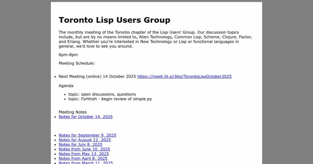Agenda: Forth-ish (how to code your own Forth, simple.py, Forthish discord server, etc.) general discussion https://torlisp.neocities.org/ Toronto Lisp Users Group torlisp.neocities.org
