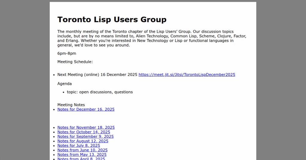 Toronto Lisp next meeting (online) Dec. 16, 2025 https://torlisp.neocities.org/ Toronto Lisp Users Group torlisp.neocities.org